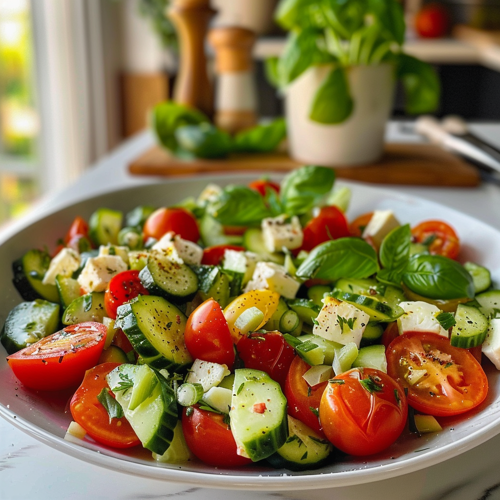 Start by chopping the tomatoes and cucumbers into bite-sized pieces, then add mozzarella cubes. Drizzle with olive oil and balsamic vinegar just before serving for optimal freshness.