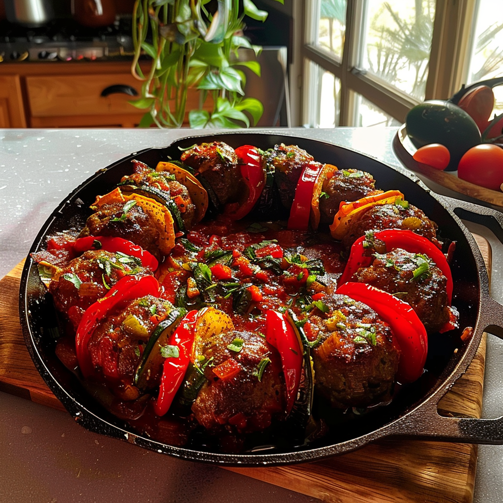 Stuffed Vegetables with Meatballs in Skillet is a vibrant, one-pan dish that transforms colorful bell peppers, zucchini, and tomatoes into a flavorful masterpiece. Each vegetable cradles juicy meatballs, infused with aromatic herbs and spices, making it perfect for family dinners or casual gatherings.