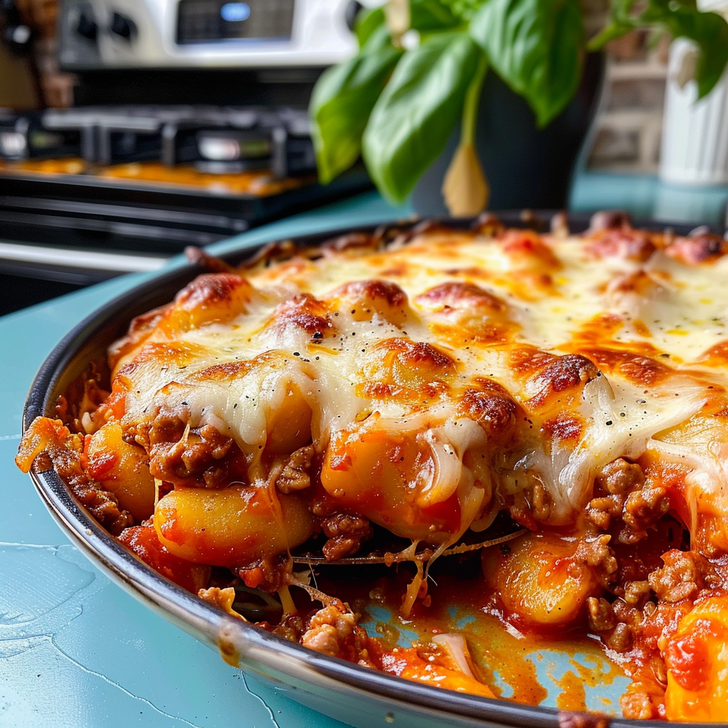 Begin by browning the ground meat for the Bolognese sauce, then simmer it while boiling the gnocchi. As soon as they’re fluffy and tender, combine everything in a baking dish.